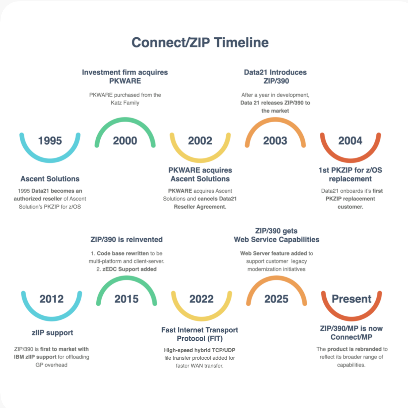 Developed entirely by Data21’s in-house development team, the product continues to evolve. Now rebranded as Connect/ZIP—a key component of the Connect/MP Suite—it has been continuously enhanced to deliver greater value for customers. Today, our development team is focused on embedding AI-driven innovations to boost efficiency, adaptability, intelligence and value across the Connect/MP product line—ensuring it remains aligned with the demands of modern mainframe environments.